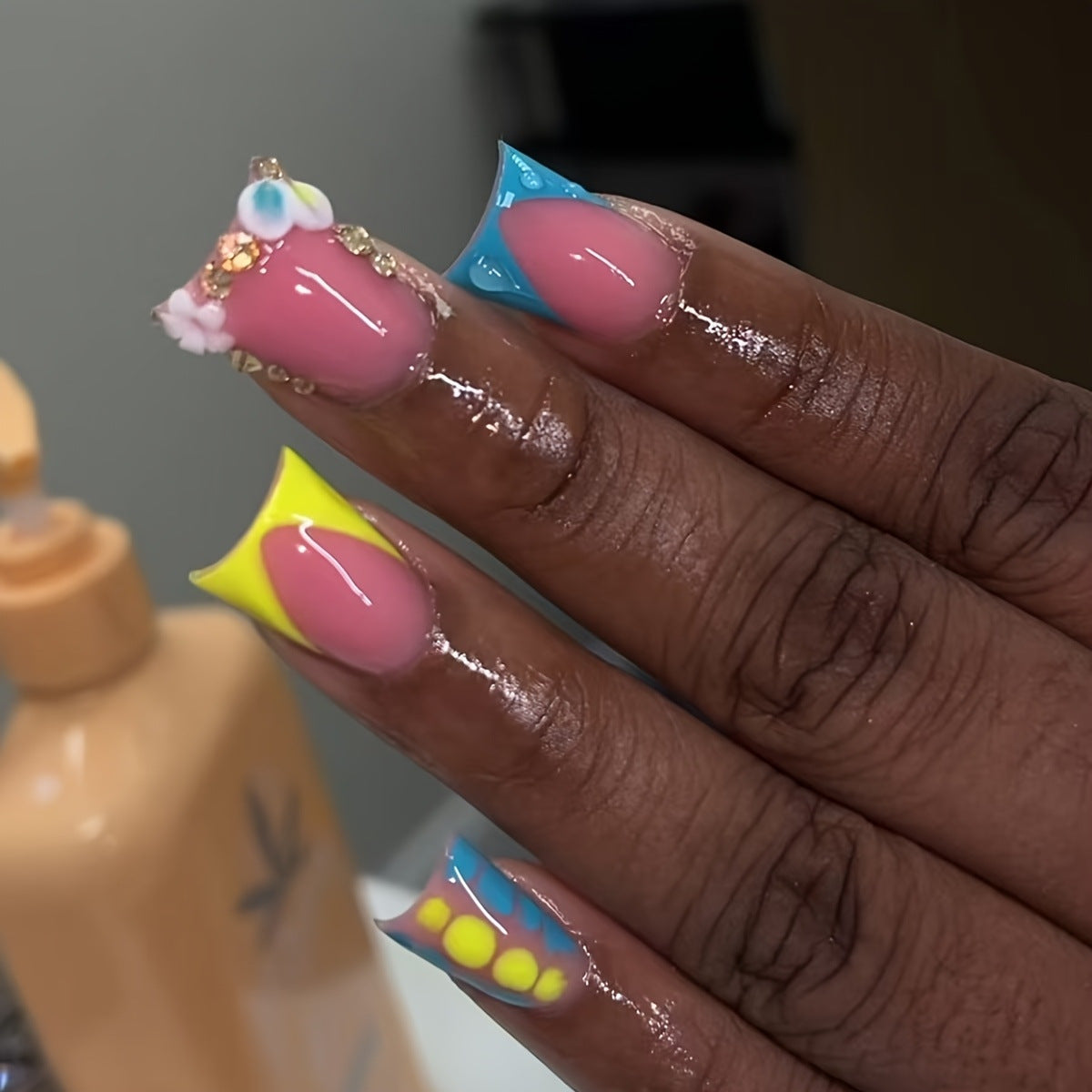 Dreamy Tropical Vibes Long Duck Shaped Bright Pink Blue and Yellow Press On Nail Set with Fun Floral Gem Accents