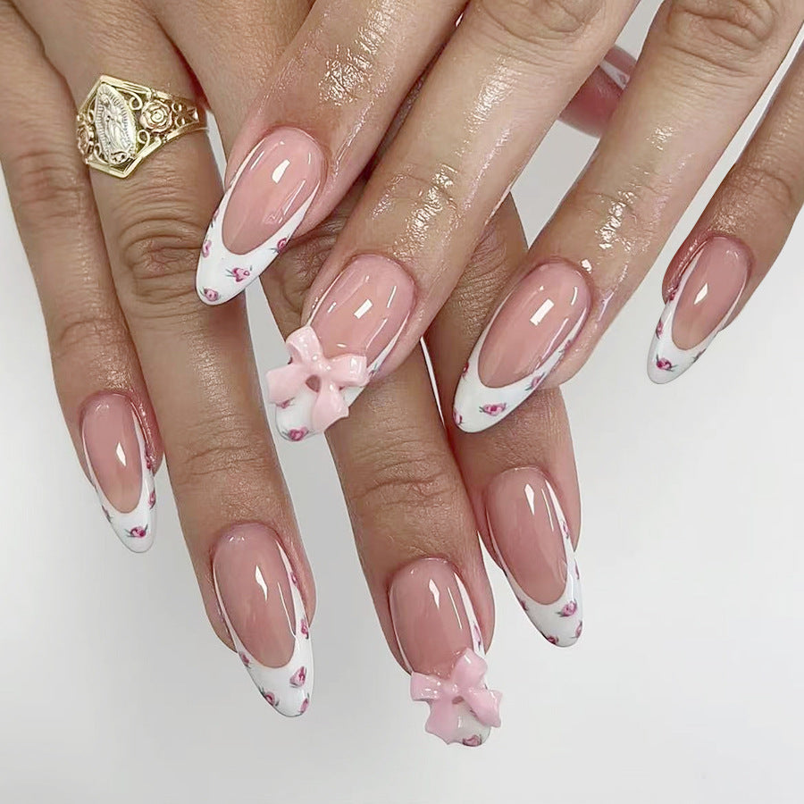 Elegant Blossom Glamour Long Almond Pink and White Press On Nail Set with Beautiful Bow and Floral Accents