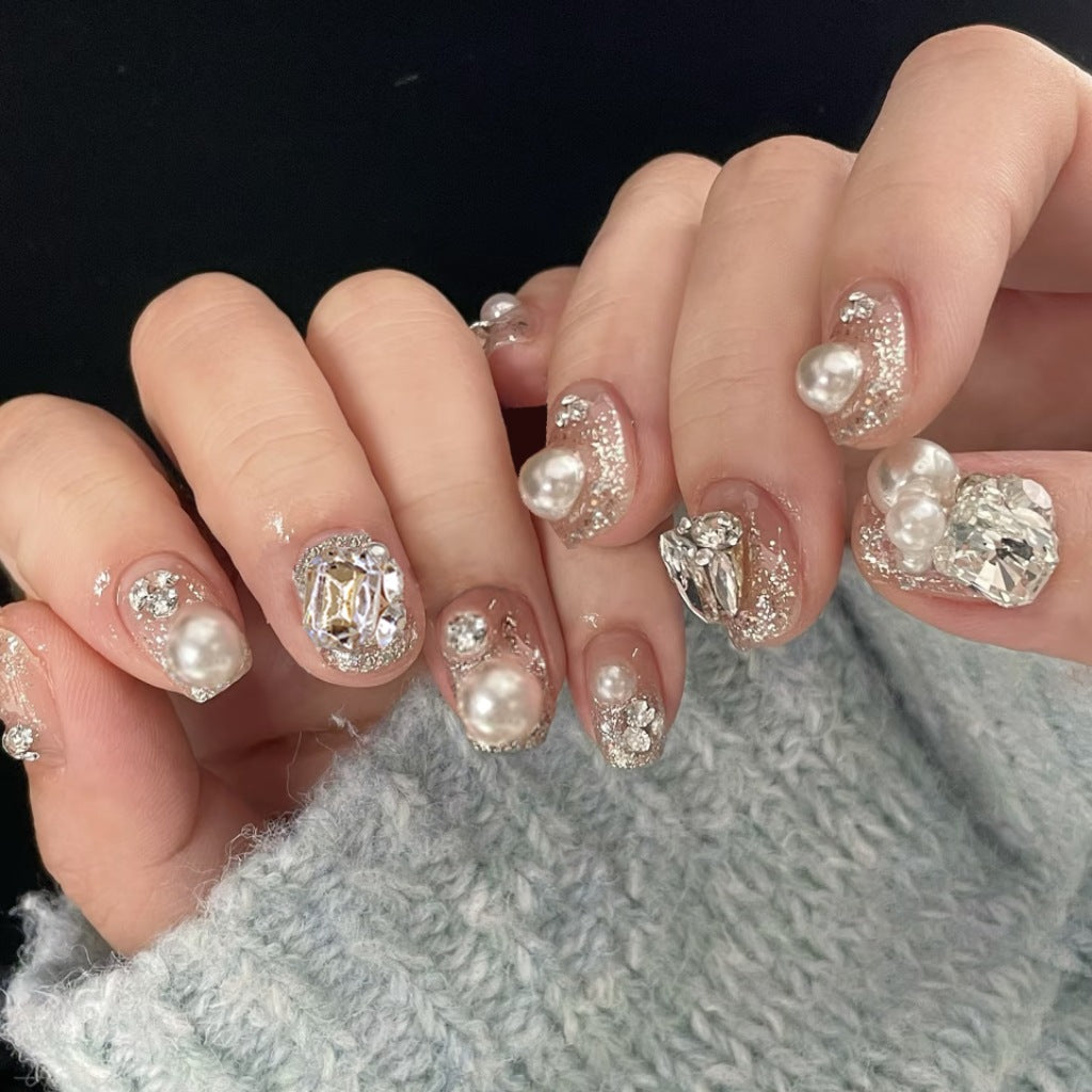 Elegant Crystalline Short Square Silver Press On Nail Set with Iridescent Gemstone Accents