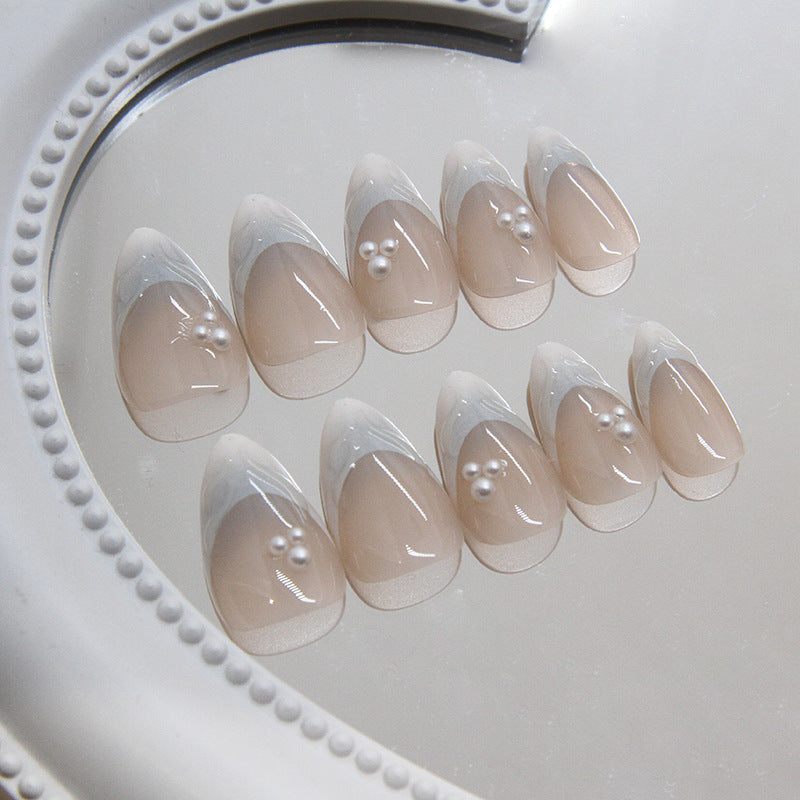 Elegant Dreamy Almond Press On Nail Set Long Clear Beige Nails with Iridescent Tips and Pearl Accents