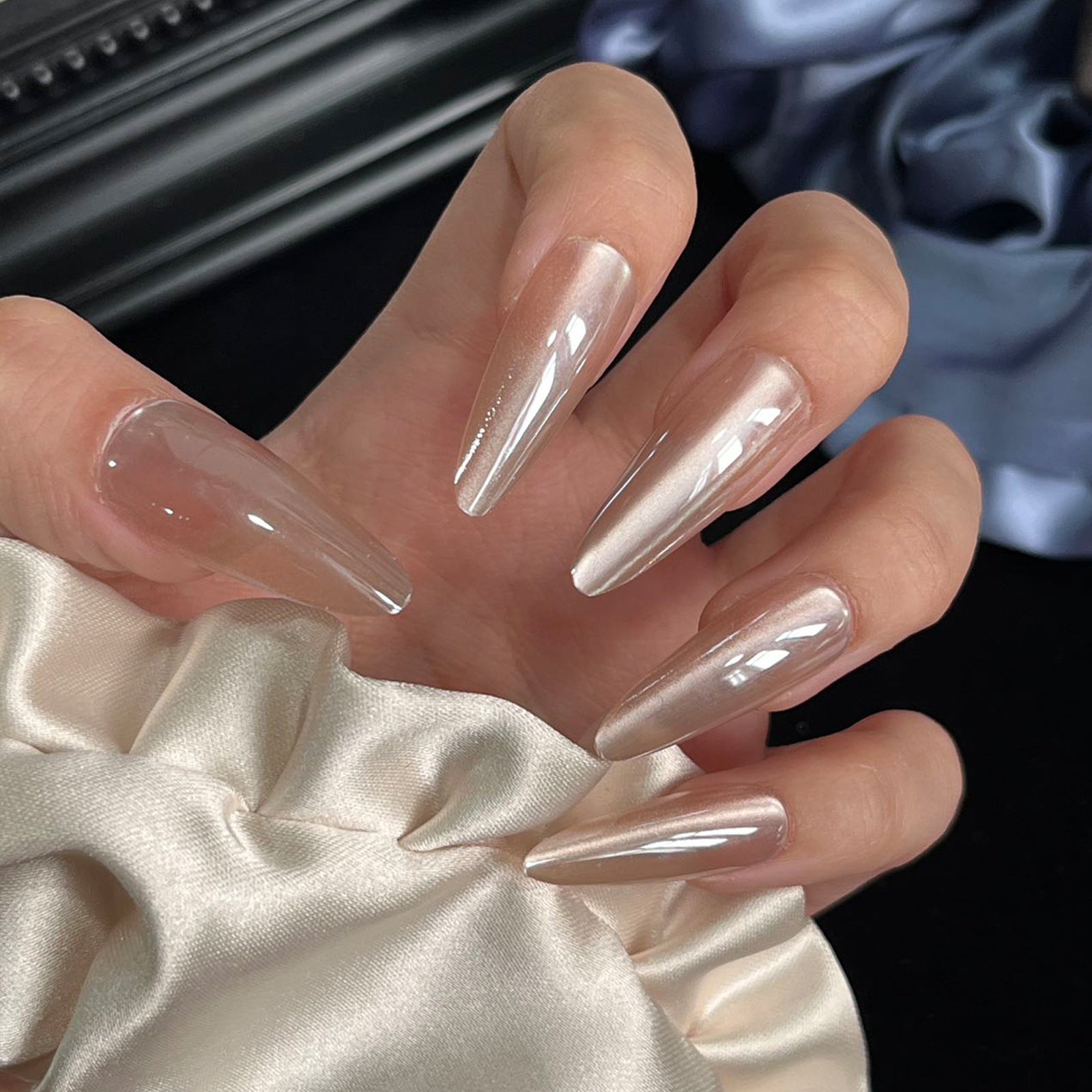 Elegant Dreamy Long Almond Shape Translucent Beige Press On Nail Set with Glimmering Finish