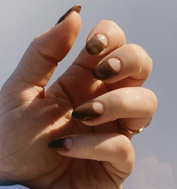 Elegant Earthy Glam Medium Oval Chocolate Ombre Press On Nail Set with Unique Half Moon Design