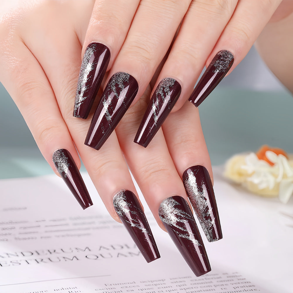 Elegant Evening Glamour Long Coffin Burgundy Press On Nail Set with Silver Glitter Accents