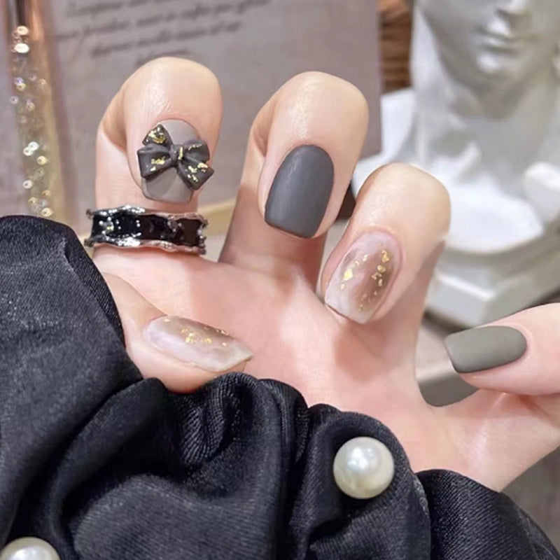 Elegant Evening Matte Gray Medium-Length Square Press On Nails with Gold Flakes Embellishment