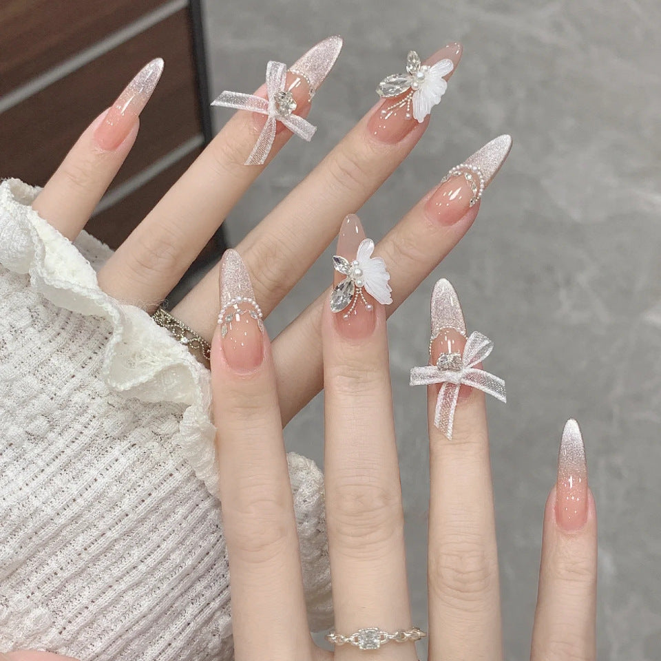 Elegant Fairy Blossom Press On Nail Set Long Almond Pink with Sparkling Floral Accents