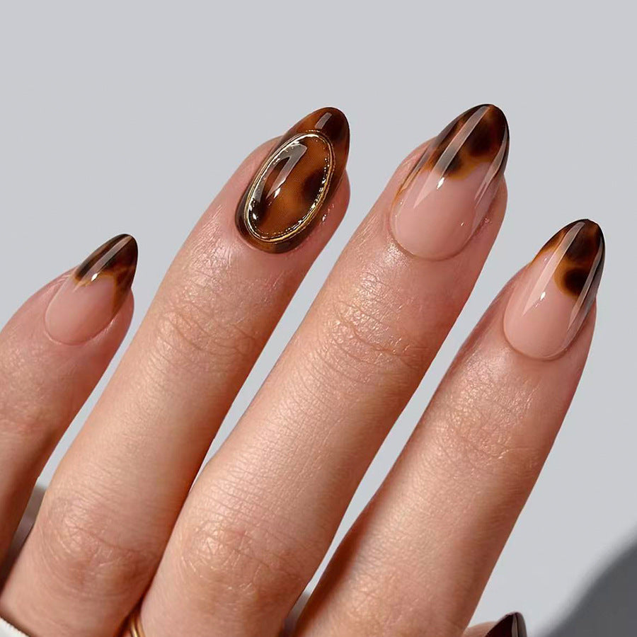 Elegant Forest Chic Medium Almond Shaped Brown Ombre Press On Nail Set with Unique Gem Accent