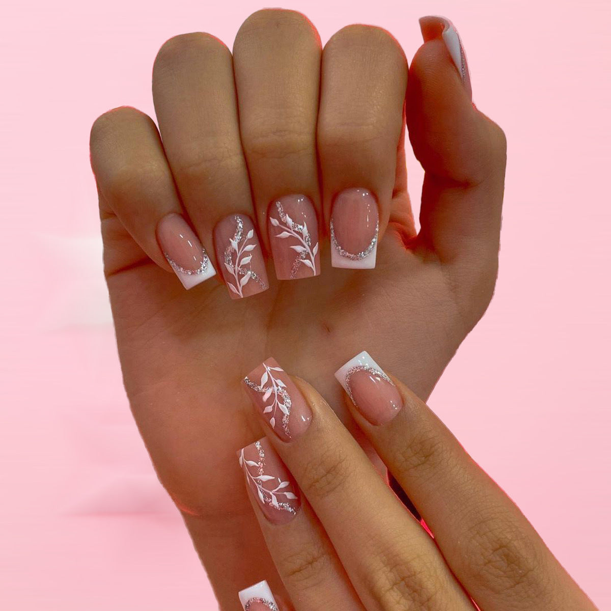 Elegant Garden Inspired Long Square Pink Press On Nail Set with Floral Design and Silver Accents