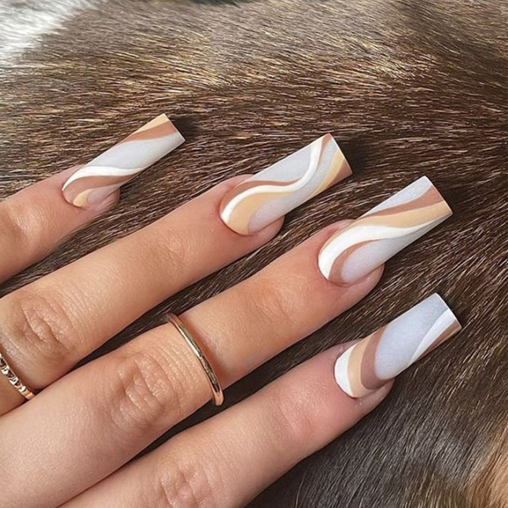 Elegant Marble Dream Long Square Press On Nail Set in White Beige and Champagne Swirl Design