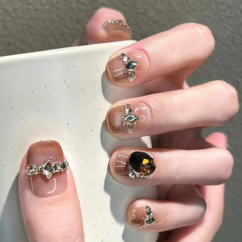 Elegant Soiree Short Round Cut Soft Pink Nail Set with Rhinestone Embellishments