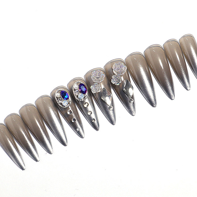 Enchanted Elegance Long Almond Shimmering Beige with Jewel Accents and Floral Embellishments Press On Nail Set