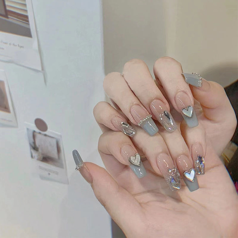 Enchanted Elegance Long Coffin Grey Press On Nail Set with Rhinestone Accents and 3D Heart Charms