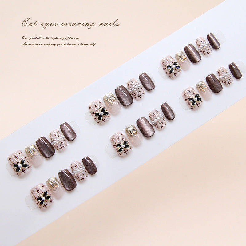 Enchanted Elegance Short Square Beige and Brown Cat Eye Design with Decorative Elements Press On Nail Set