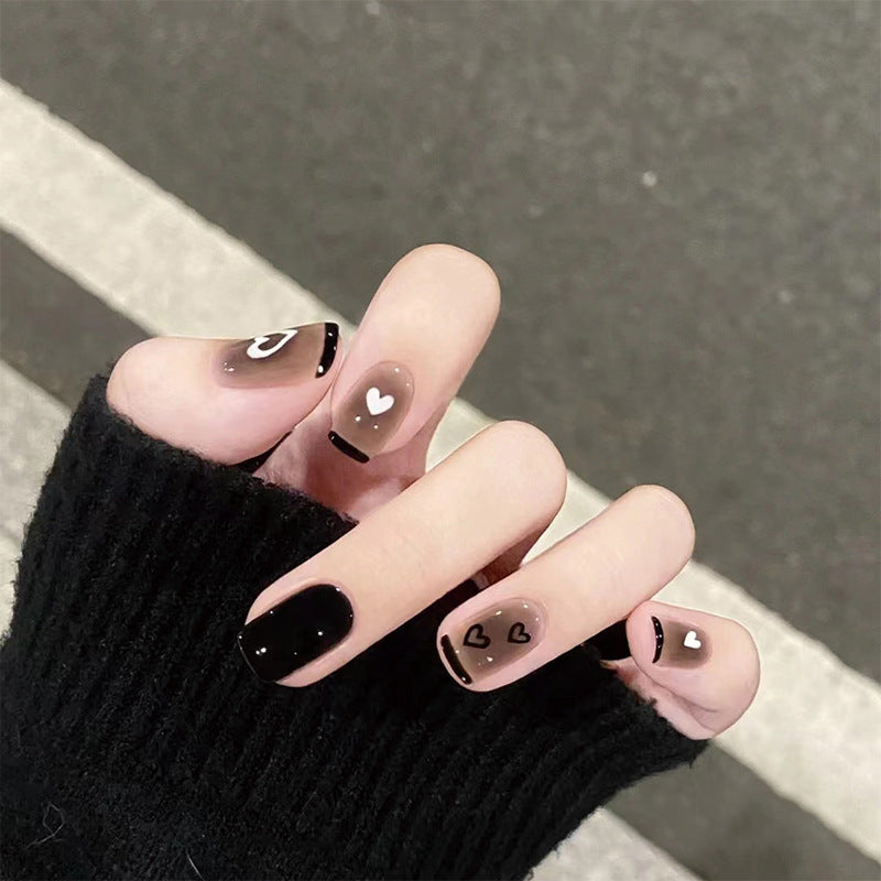 Enchanted Evening Collection Short Square Black and Beige Press On Nails with Heart Accents