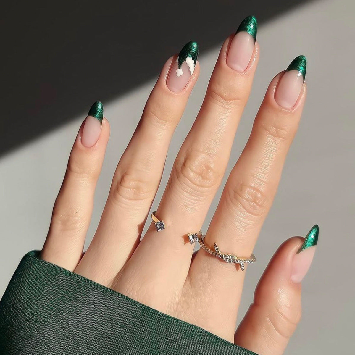 Enchanted Forest Medium Almond Green Ombre Press On Nails with Glitter Tips and Cuticle Moon Detail