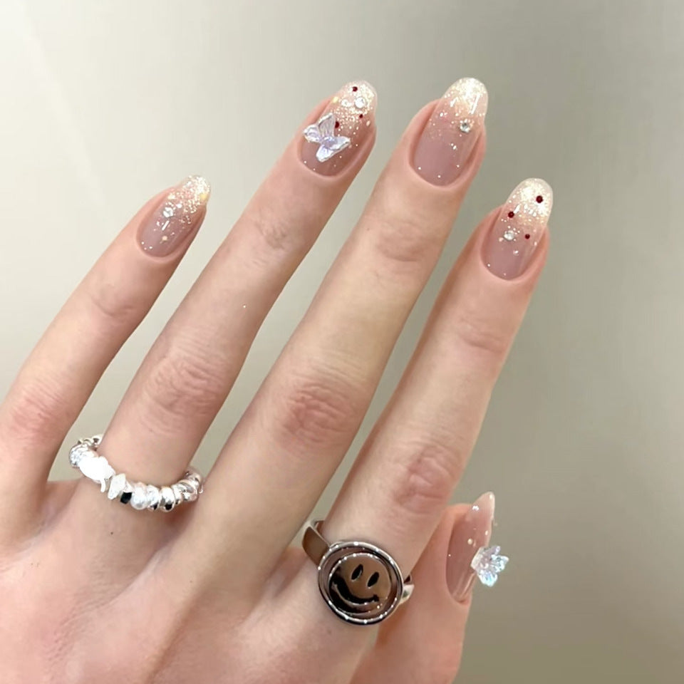 Enchanted Garden Long Oval Pink Ombre Sparkle Nail Set with Unique Butterfly Accent