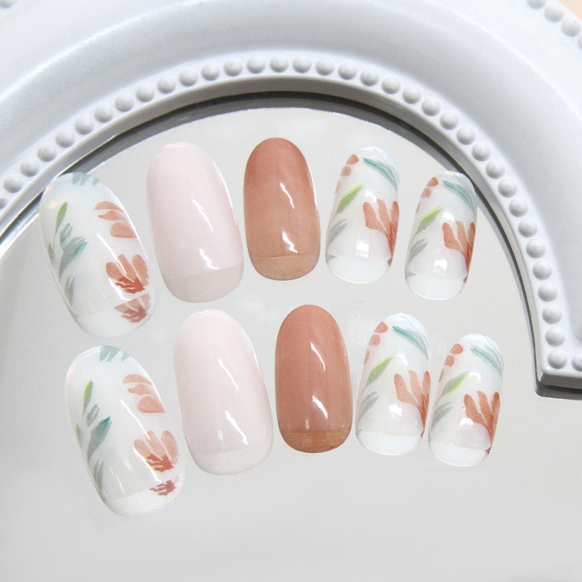 Enchanting Floral Dream Medium Oval Natural Beige and Soft Pink Press-On Nail Set with Artistic Botanical Designs