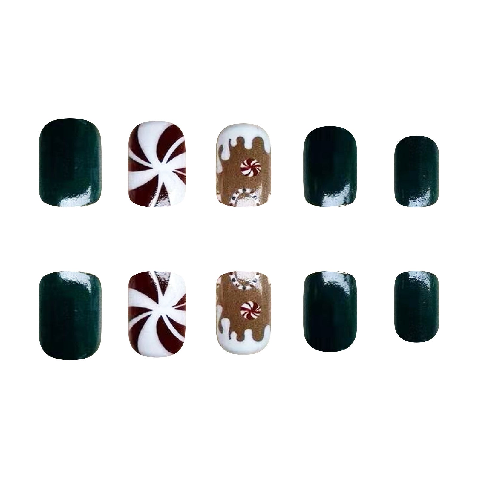 Festive Delight Medium Square Dark Green and Brown with Candy Cane Design Press On Nail Set