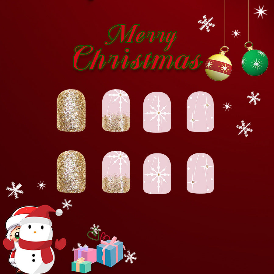 Festive Glamour Short Squoval Pink and Gold Sparkling Nail Set with Snowflake Design