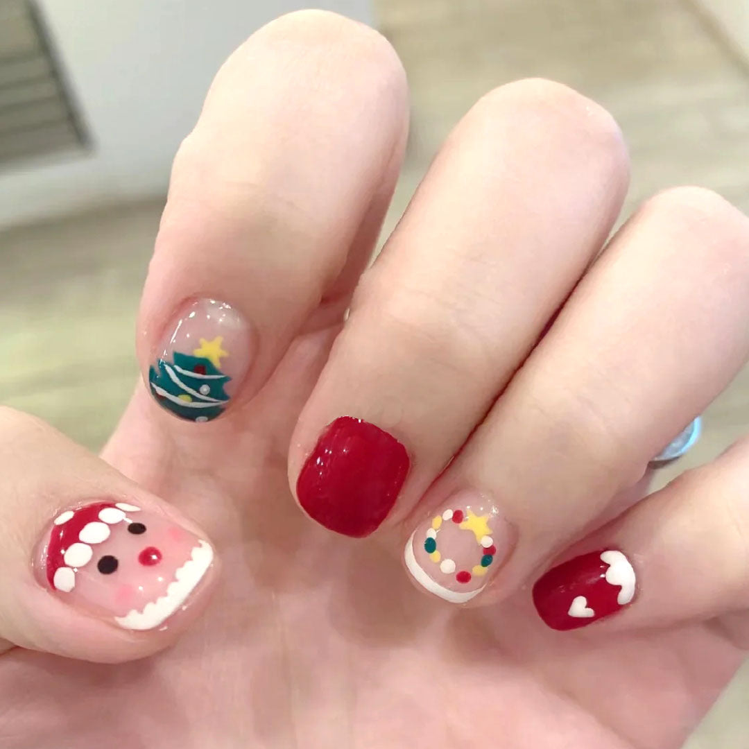 Festive Holiday Spirit Short Square Red and Clear Press On Nail Set with Charming Christmas Designs