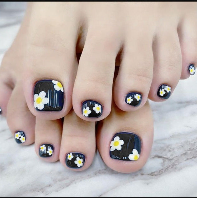 Floral Bliss Square Short Navy Blue Press On Nail Set with Charming White Daisy Accents