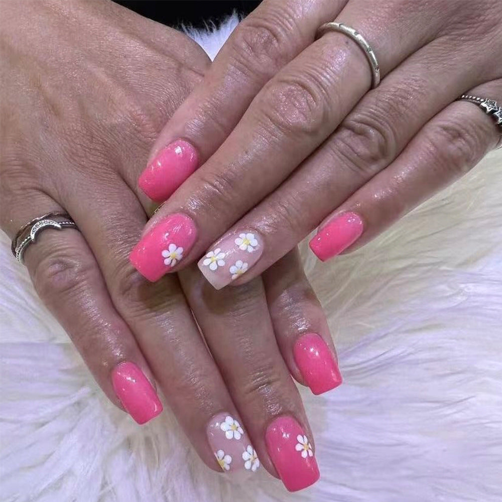 Floral Delight Long Square Pink Press On Nail Set with Daisy Design