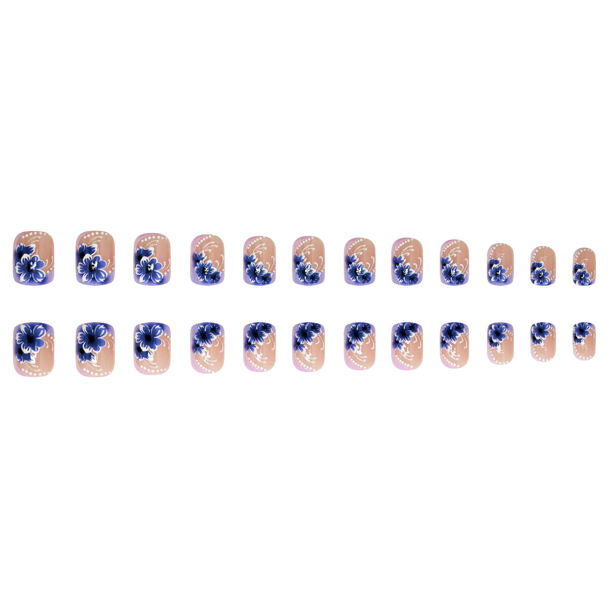 Floral Elegance Short Square Blue and Beige Glossy Press On Nail Set with Intricate Flower Designs