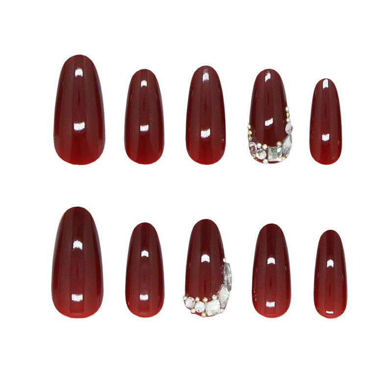 Glamorous Elegance Long Almond Deep Red Press On Nail Set with Stunning Gemstone Accents