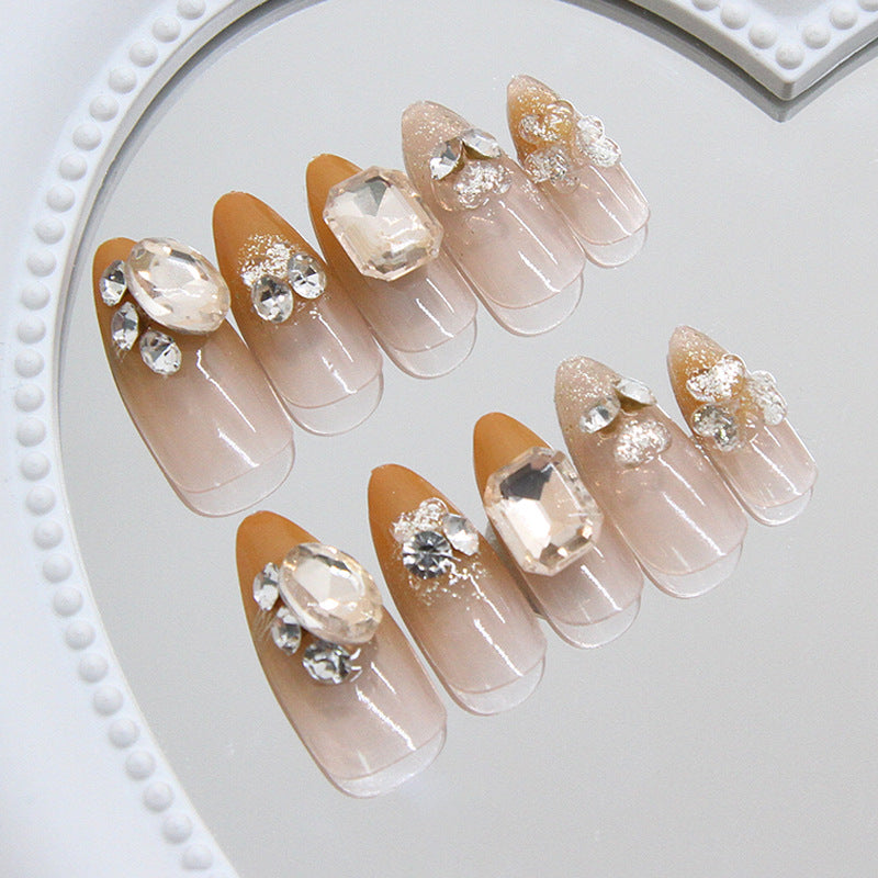 Glamorous Elegance Medium Almond Beige with Sparkling Crystal Accents Press on Nail Set