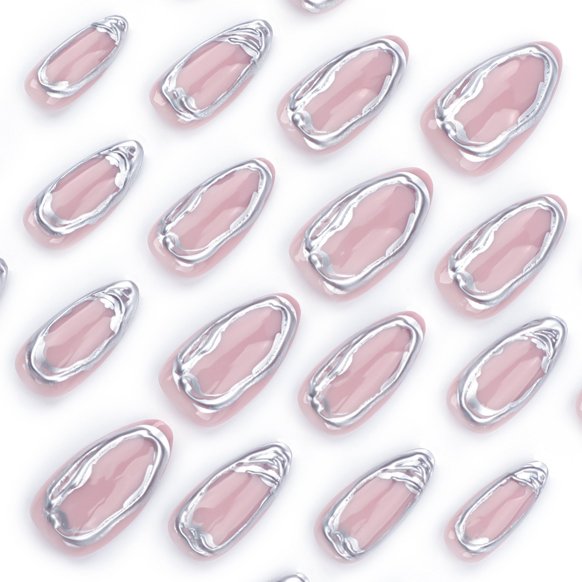 Glamorous Elegance Short Almond Pink Press On Nails with Shiny Silver Edge Design