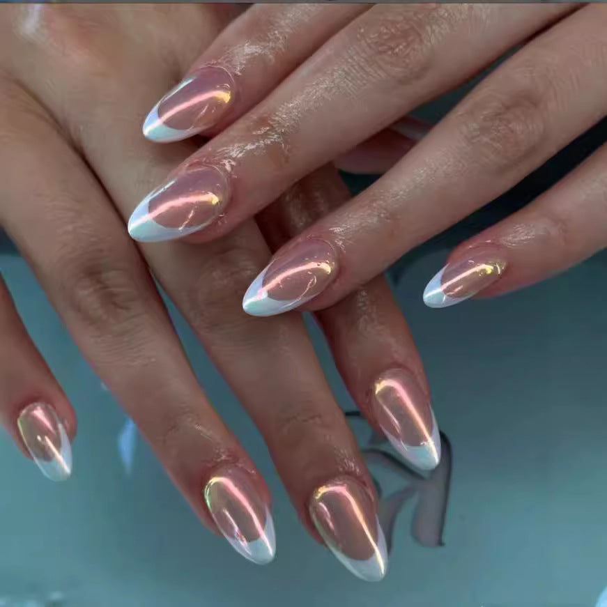 Glamorous Enchantment Long Almond Shaped Iridescent Pink and White Press On Nail Set with Unique Shimmer Finish