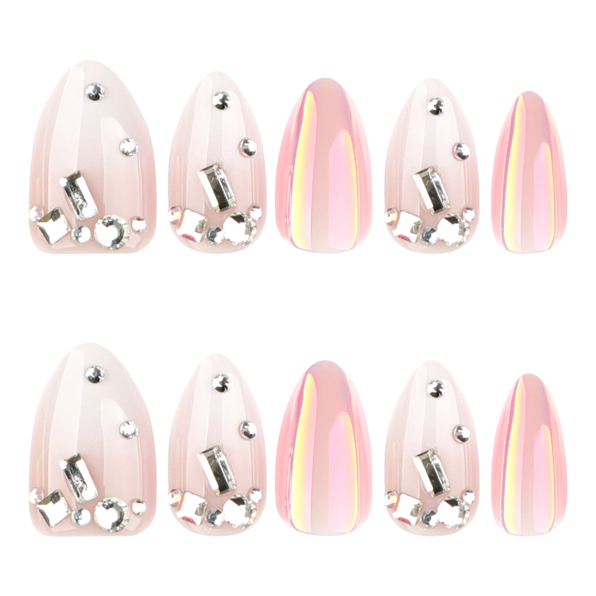 Glamorous Pink Short Almond Shaped Press On Nail Set with Iridescent Shine and Sparkling Jewels