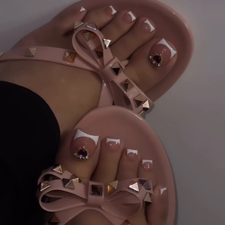 Glamorous Summer Celebration Short Square Pink Press On Nail Set with White Tips and Rhinestone Accent