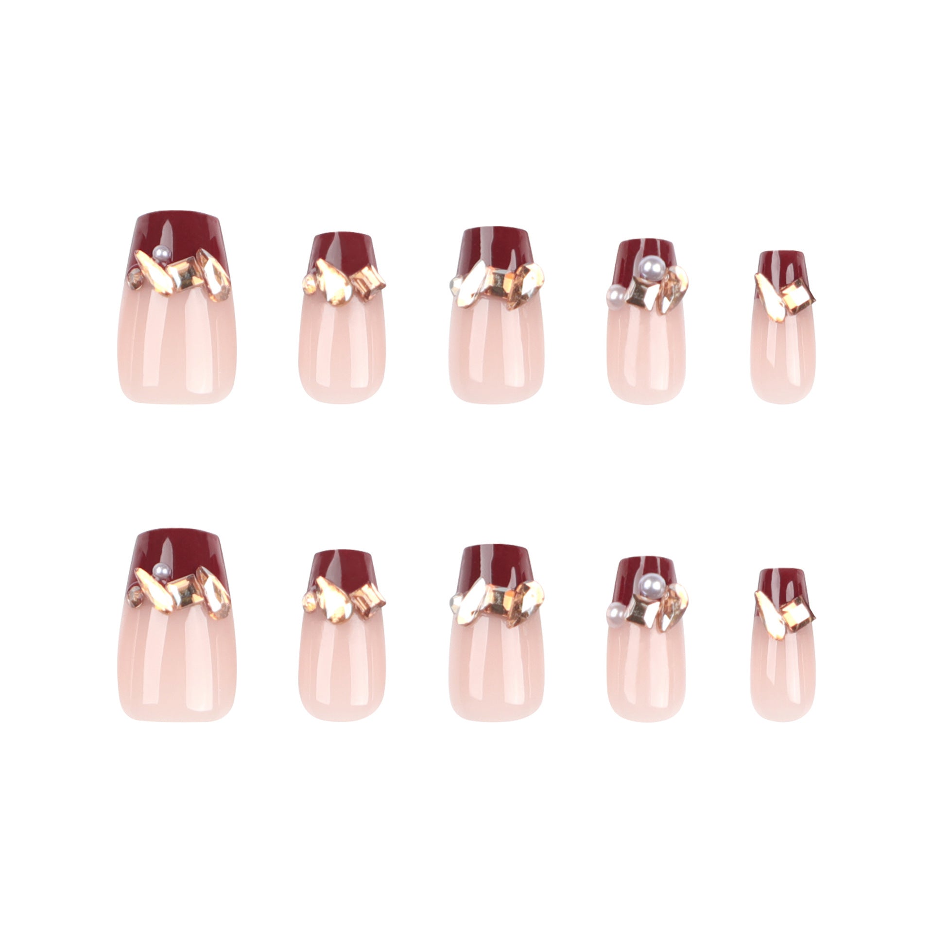 Glamourous Elegance Short Coffin Burgundy and Beige Nail Set with Dazzling Gem Accents
