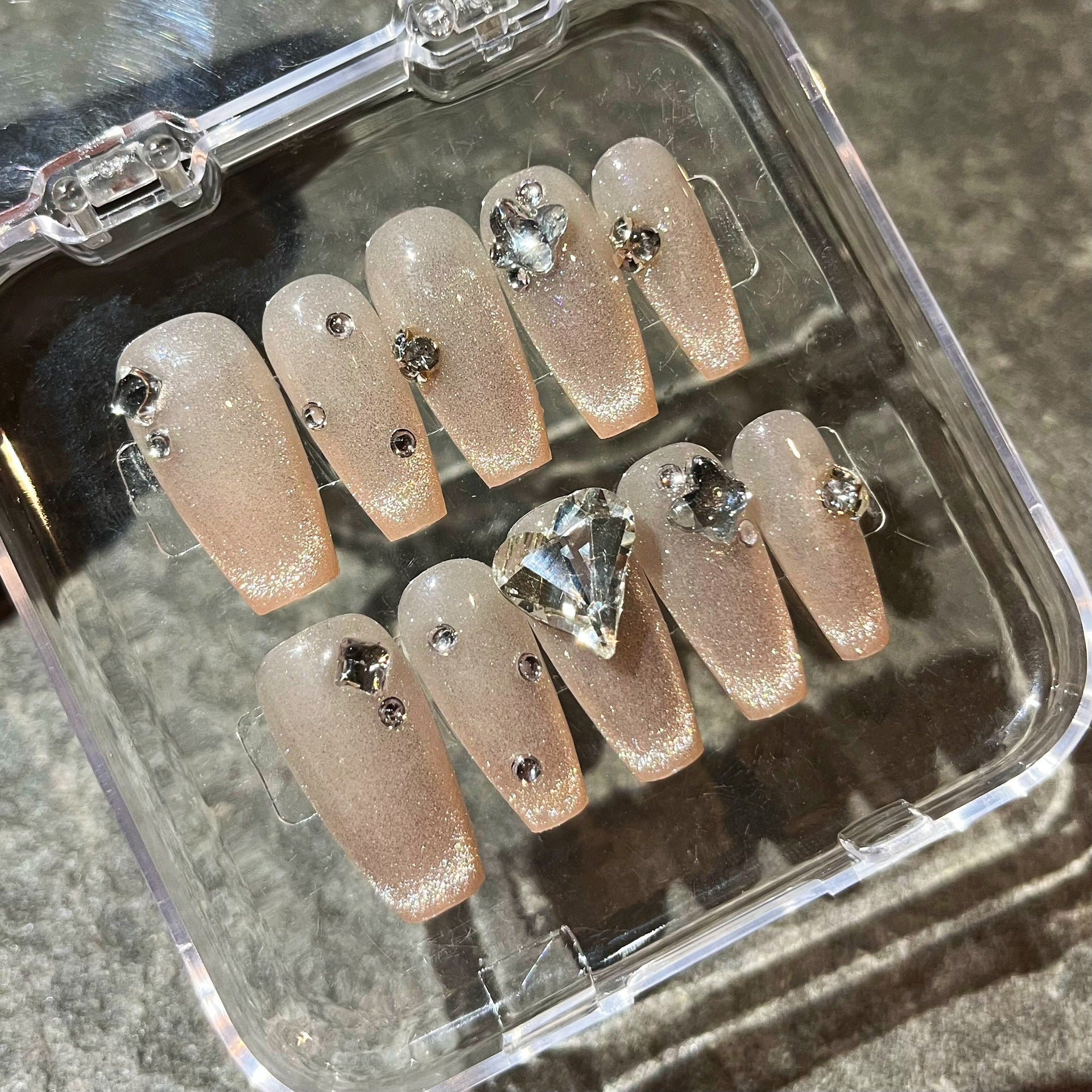 Glimmering Dream Press On Nail Set Long Coffin Shape Shimmering Beige with Rhinestone Accents