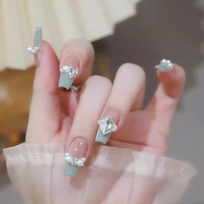 Glistening Ocean Breeze Long Coffin Mint Green Press On Nail Set with Pearl and Jewel Accents