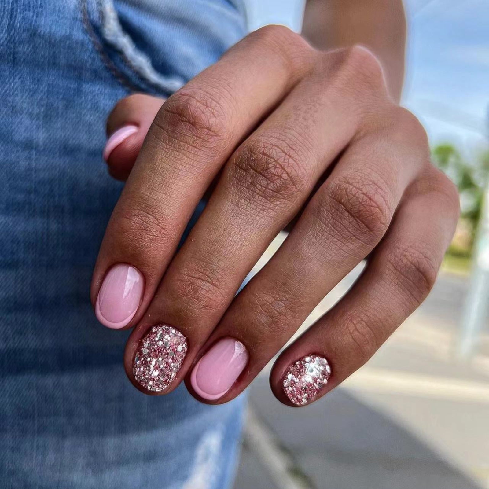 Glittering Glamour Short-Length Oval Pink Press On Nail Set with Sparkling Accents