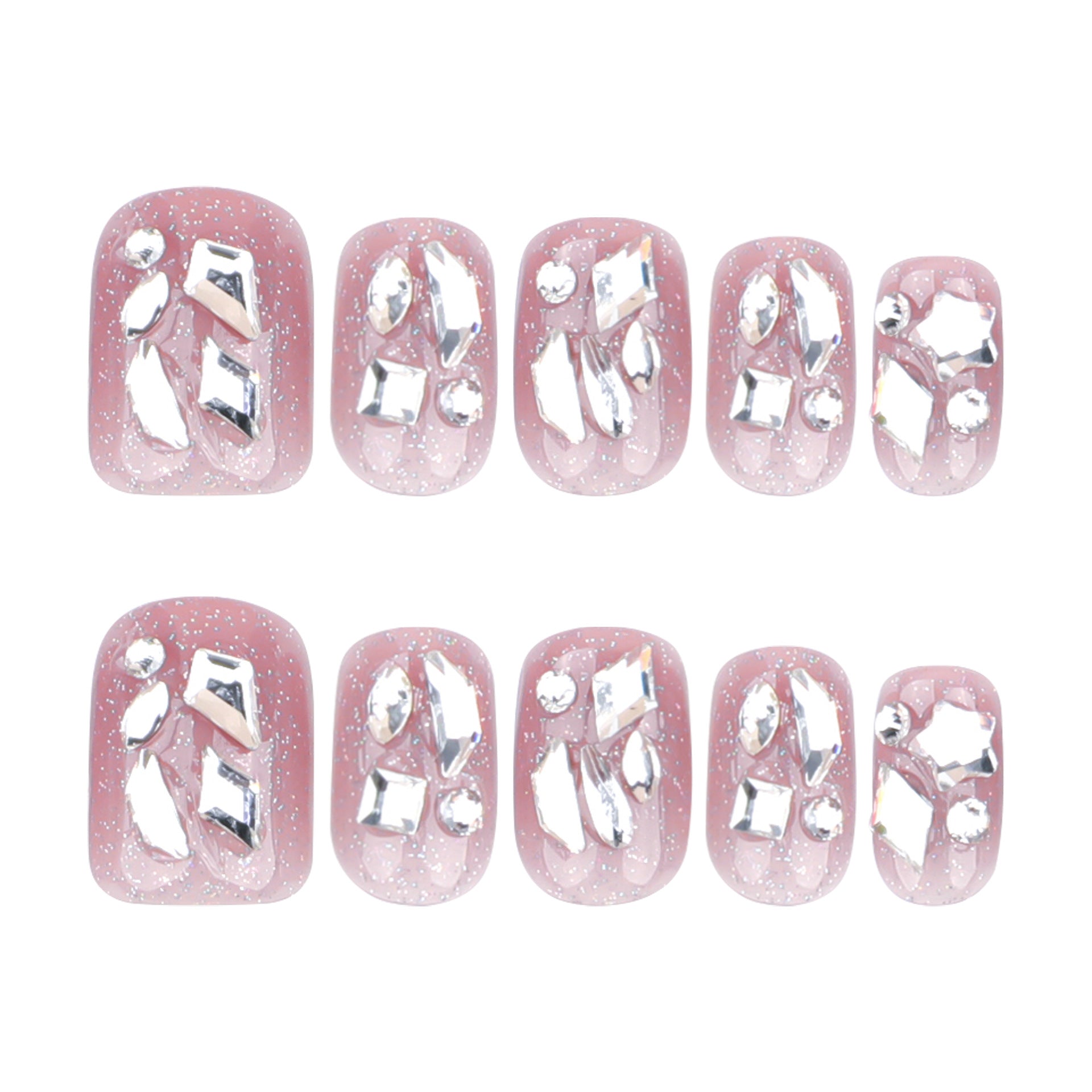 Glittering Rose Dream Short Square Soft Pink with Sparkling Gemstone Accents Press On Nail Set