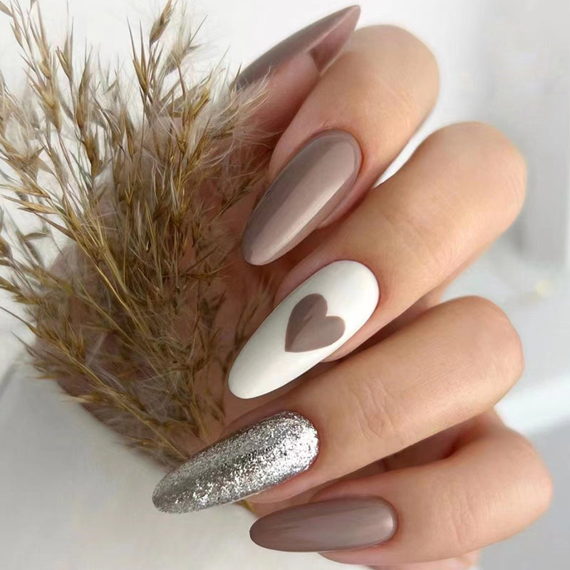 Hot Mama Long Oval Brown Hearts Press On Nails