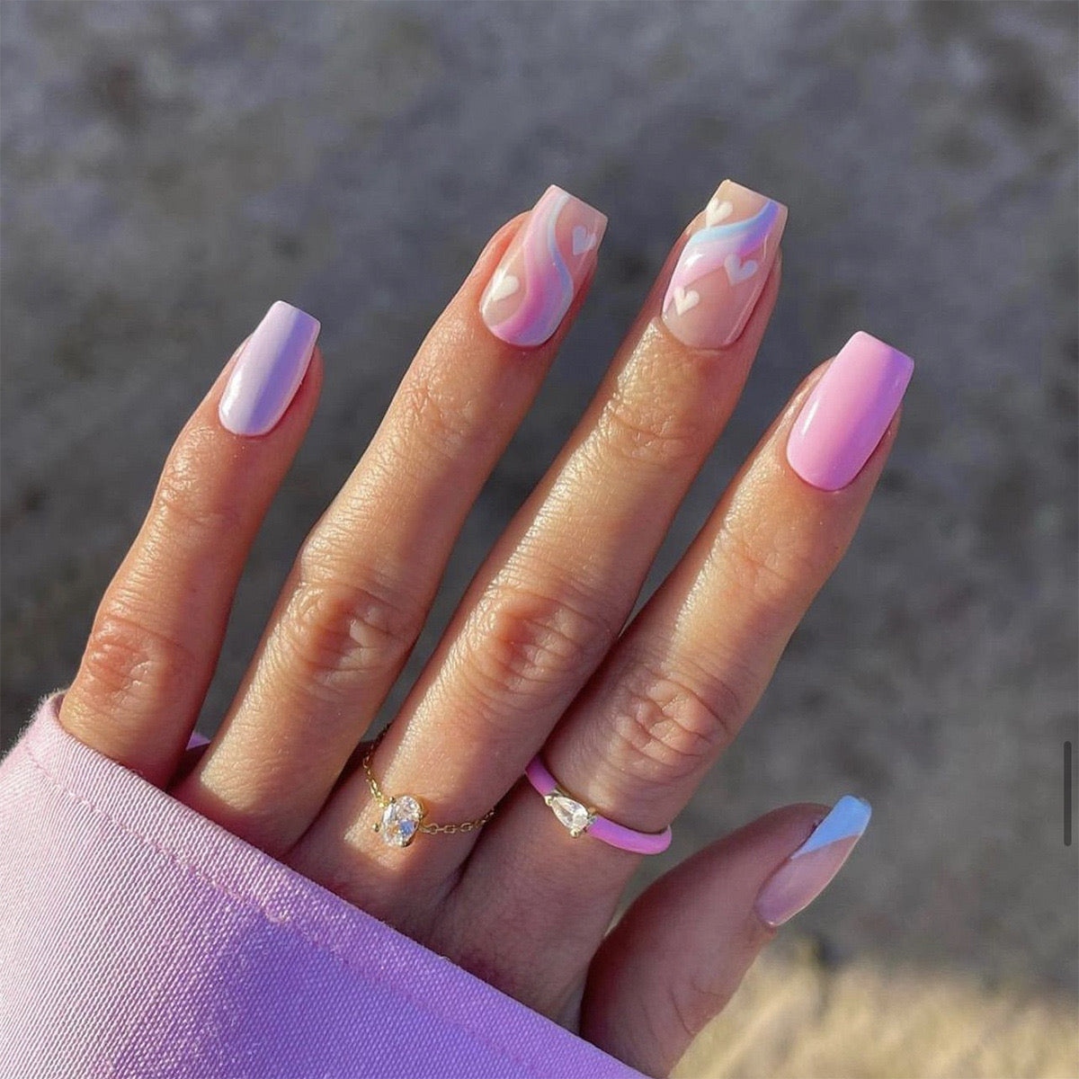 Iridescent Skies Medium Square Multicolor Hearts Press On Nails