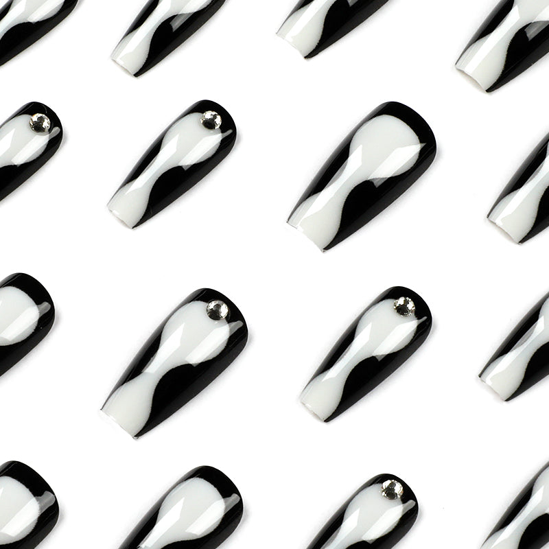 White Swirl Lines Medium Coffin White Everyday Press On Nails