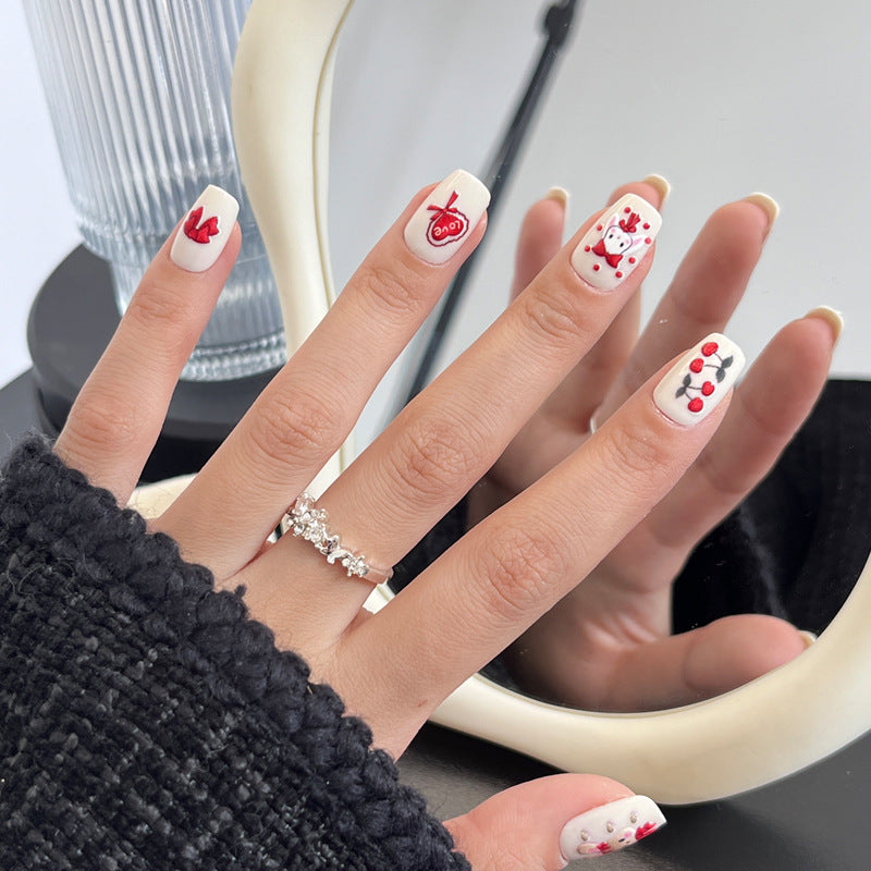 Love-Inspired Short Square Press-On Nails in Elegant White with Charming Red Accents