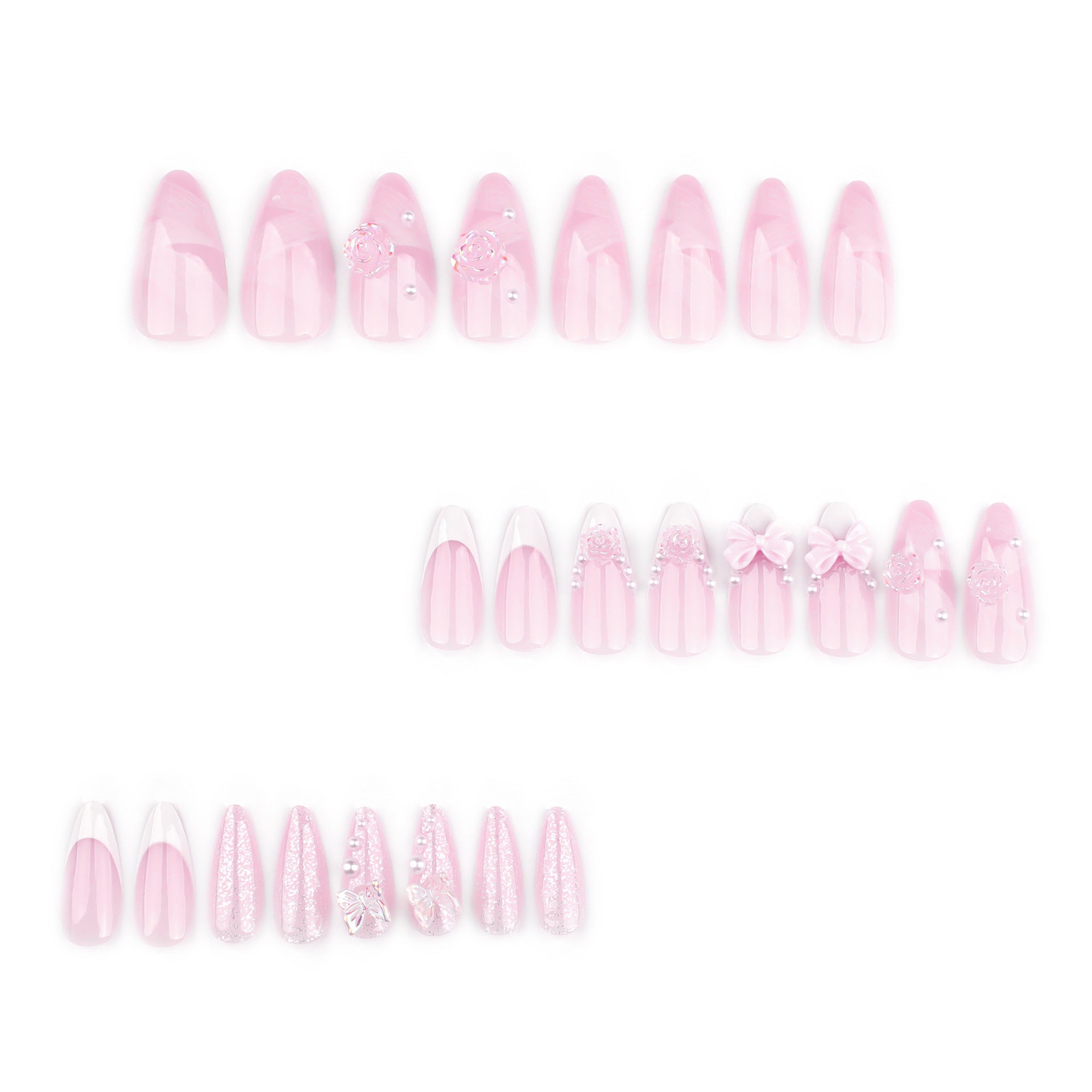 Lovely Petal Whimsy Short Almond Pink Press on Nail Set with Floral Embellishments and Shimmering Accents