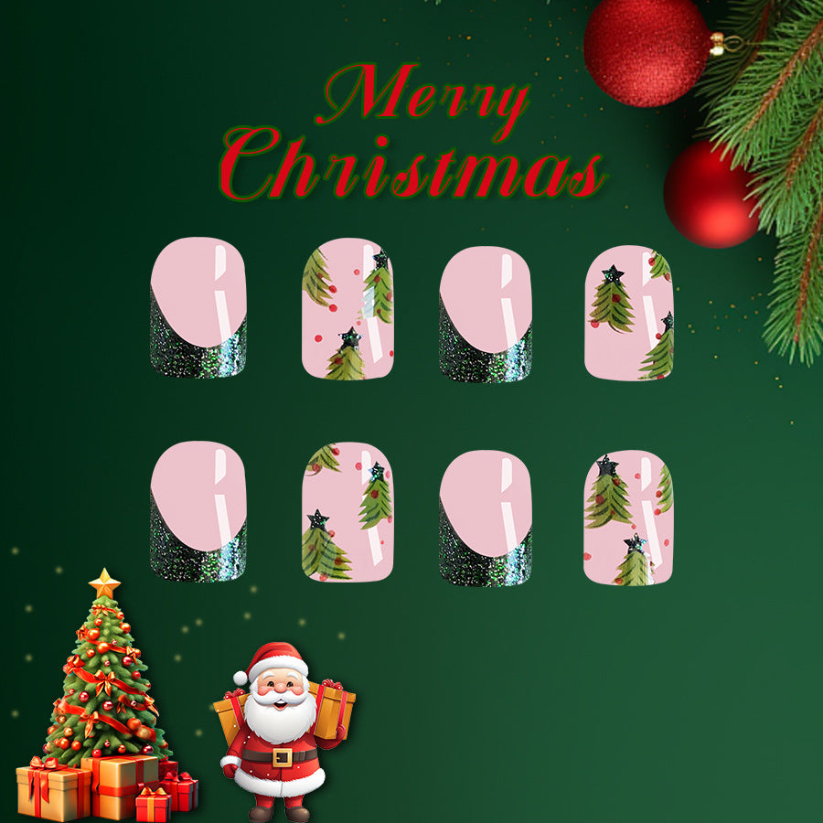 Merry Christmas Festive Square Pink Green Glitter Press On Short Nail Set with Holiday Tree Design