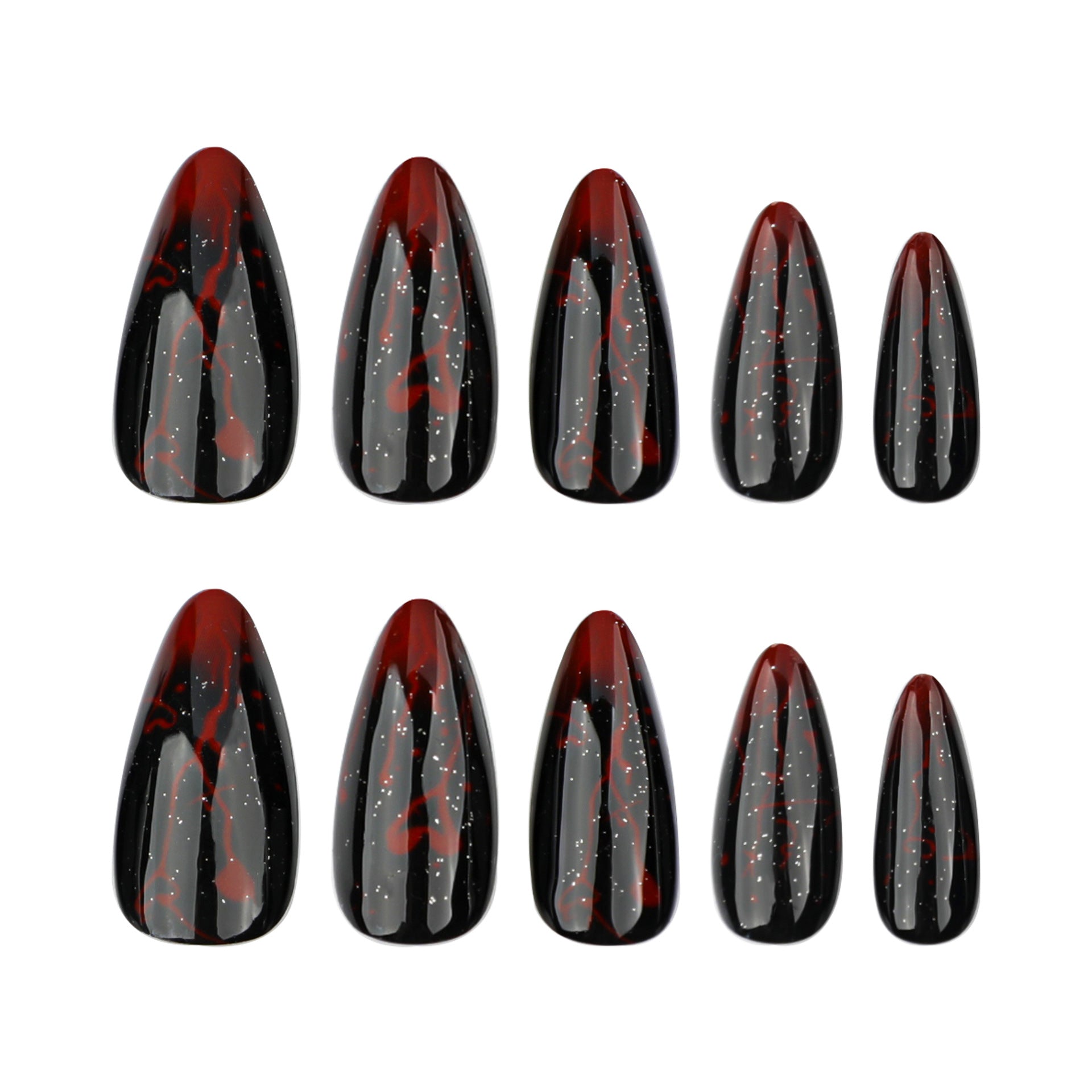 Mystical Elegance Short Almond Black and Red Swirl Press On Nail Set with Glitter Accents