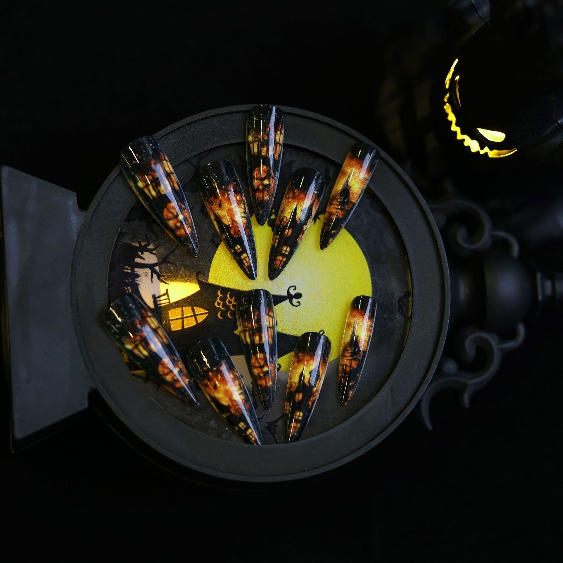 Mystical Halloween Long Stiletto Black with Fiery Haunted House Design Press On Nail Set