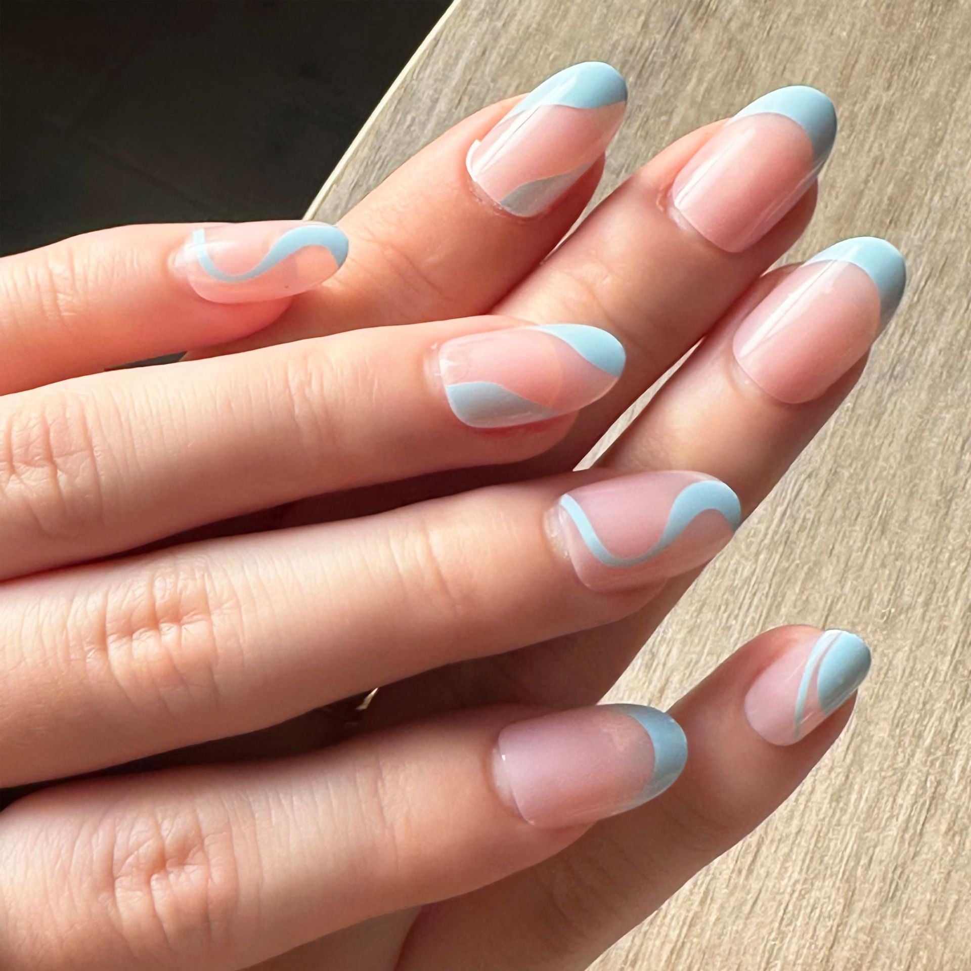 Ocean Breeze Long Almond Blue and Pink Swirl Press On Nail Set