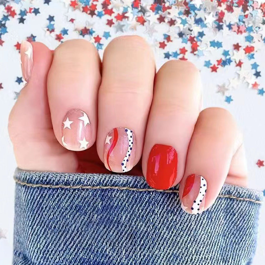 Patriotic Parade Short Oval Red White Blue Press On Nails with Star Accents for Festive Manicure