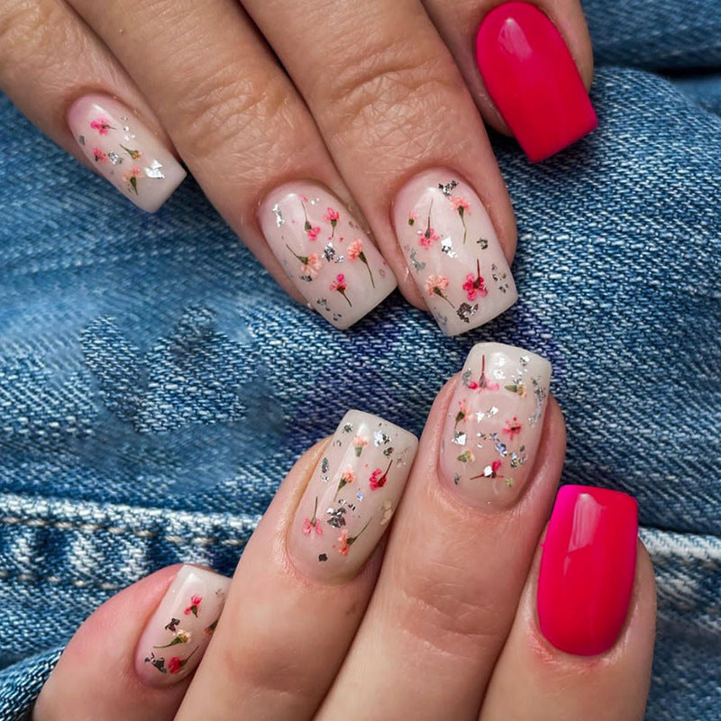 Blushing Bouquet Short Almond Pink Floral Press On Nails