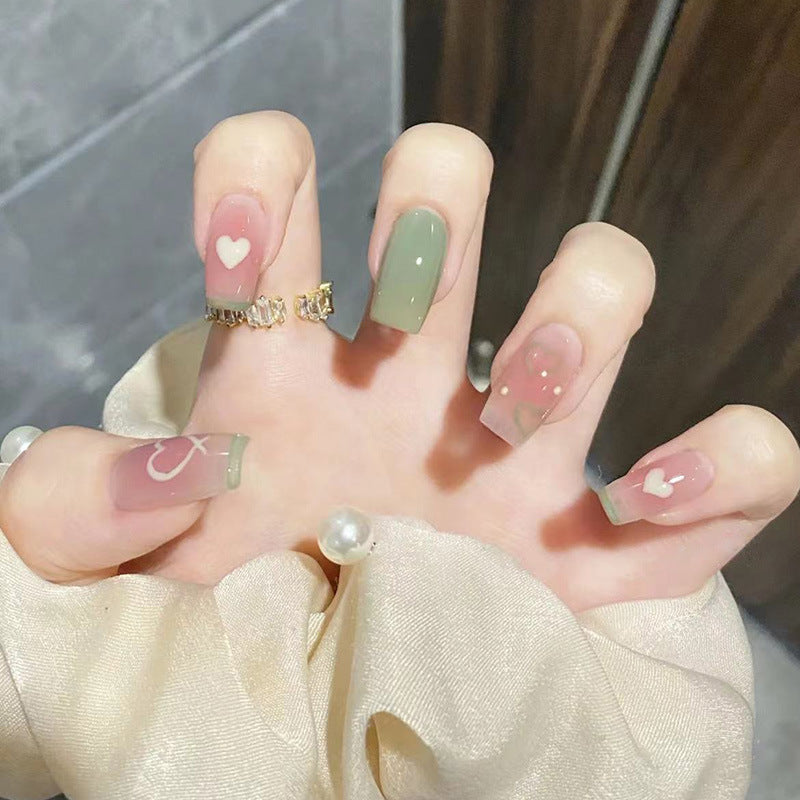 Romantic Affair Long Coffin Olive & Blush Pink Press-On Nail Set with Love Heart Accents
