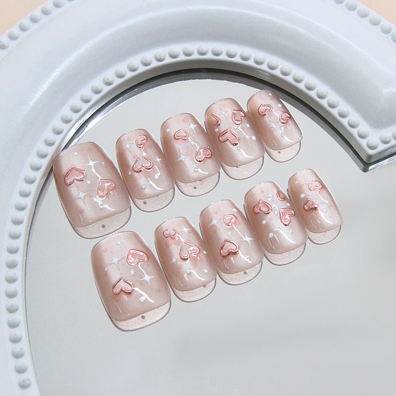 Romantic Bliss Short Square Beige Nails with Adorable Heart Designs